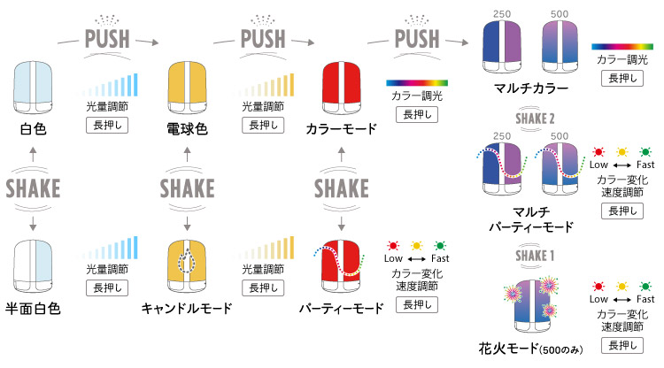 PUSH&SHAKEの感覚的な操作でモードやカラーの変更が可能